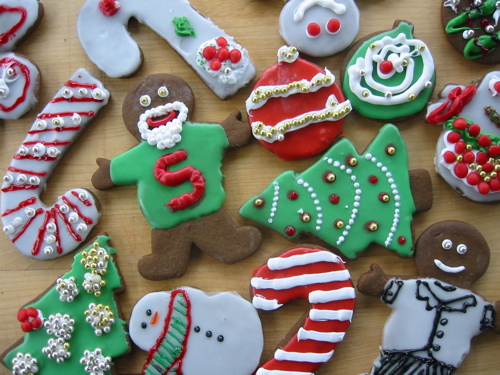 …was a success! Lots of solid entrants this year, including an office-casual Santa in a green sweater, a number of fine snowmen, avante-garde ornaments and a virtual forest of decked-out trees (notice also my little gingerbread baker on the bottom right in full kitchen attire). They’ll be tough to give away, especially if little Josephine has anything to say about it (being 3, she’s much more into receiving). As you can see we employed a variety of media, none of which will pass muster at any self-respecting pastry school. Everything from those little gel pens (for adults only since they contain serious food colorants) to the Cheeze-Wiz like frosting containers that extrude perfect icing at a very manageable rate. I’d never seen them before, but for kids ya just can’t beat’em. A good time was had by all!