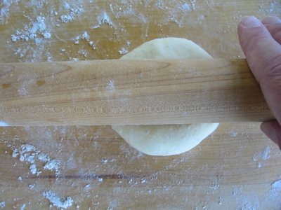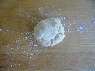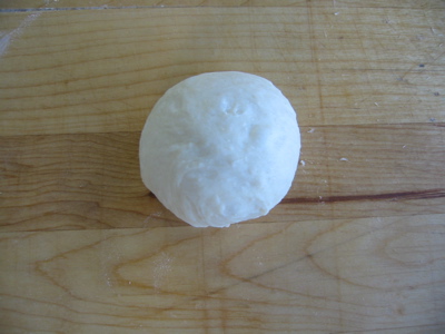 Round and round. As I mentioned, getting the right amount of flour down on the board is crucial to the whole rolling process. Too much and the ball will just skate along under your hand. Too little and it’ll stick. From these pictures you can’t even tell that there’s any flour there. Trust me though, there is. A few rotations and I’m done: