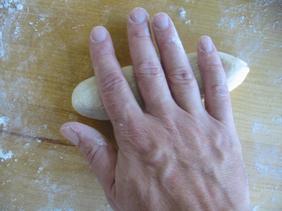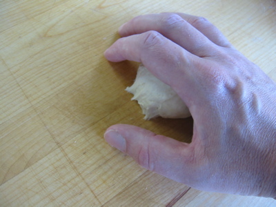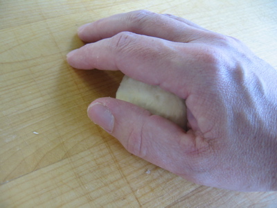 The important thing to remember is that dough rolling is not like forming a ball of, say, play dough. You’ll be using a lot less pressure, and much less of the surface of your hand. In fact it’s your work board that will be doing most of the work. So, bring your hand down over the dough like so: