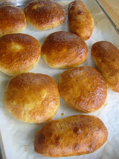After an hour proof and twelve or so minutes in the oven you should have some nicely risen and crusted (though not crust-y) hamburger and hot dog buns that can be frozen for a month or more.