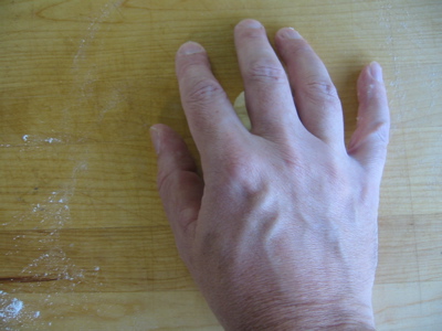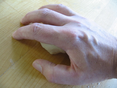 Notice that my hand is essentially working like a cage. My fingers are curved, with my fingertips on the board. My palm is barely touching the dough: