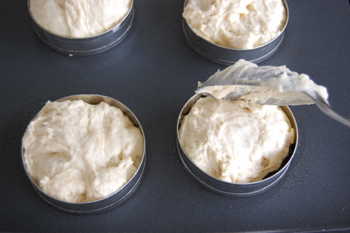 Hey! How did I suddenly manage to switch spoons? Oh, I remember, the batter is very gooey and hard to pick up, so I switched from wood to metal. You’ll want roughly 1/3 cup of batter in each ring.