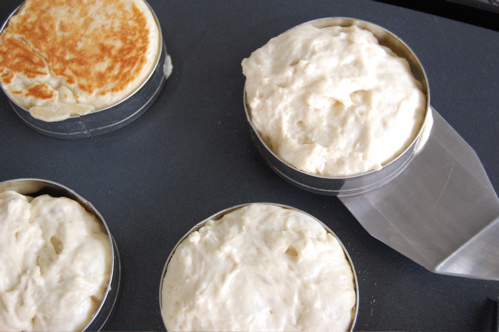 The standard self-cleaning ice cream scoop is a good spoon to use–sprayed with cooking spray and wiped drier. My first try today came out pretty well–but I had troubles getting the ring and muffin to go in the same direction when I was flipping them. Is there a trick to it? My starter is a bit thinner than most and I needed a couple of extra T. of flour; it made nine muffins.