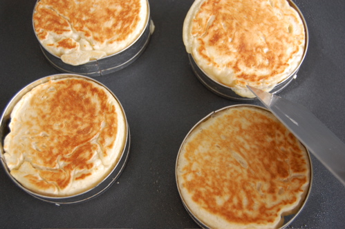As a final note, recipe writers (including Mr. Brown) love to advise that in place of buying rings for various culinary applications, you can simply “cut the bottoms off empty tuna cans”. That trick hasn’t worked since the 80’s, since modern tuna cans have lipless, rounded bottoms. These make the cans easy to stack on store shelves, but render them impossible to cut with a conventional opener. So don’t risk opening up an artery messing with jagged metal. If you don’t want to bother with ordering rings, just plop the batter right on the griddle. The muffins won’t be quite as round or tall, but they’ll be every bit as good.