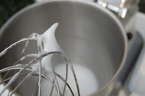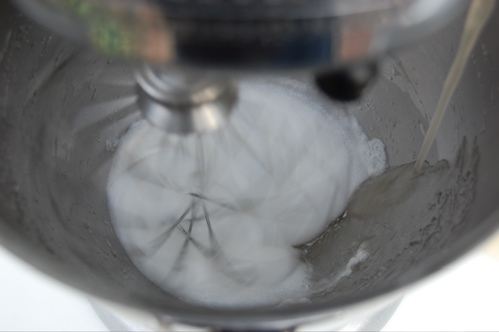When the syrup starts to bubble, get the egg whites whipping in your stand mixer. Whip to the stiff peak stage: