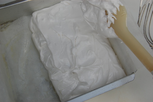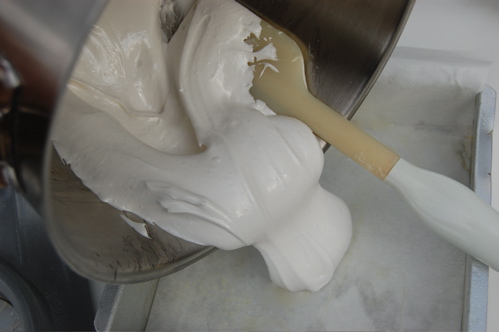 Because I didn’t have the timing of my equipment down just right on the first try, my meringue/syrup mixture looked a little runnier than yours–but no matter–once the gelatin set up, the texture was just fine.