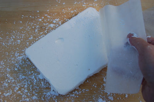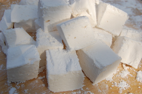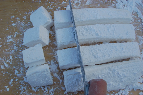 At this point I usually refrigerate my marshmallows, uncovered, since that helps them set up faster. When ready, simply flip the slab out onto a cutting board which you’ve dusted generously with powdered sugar: