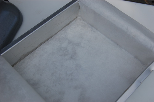 Scrape the fluff into the pan, not worrying too much about even distribution. This pan is bigger than I need, however because marshmallow sets up so fast, I can form it up into a fairly even slab without it spreading much.