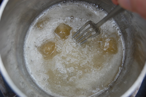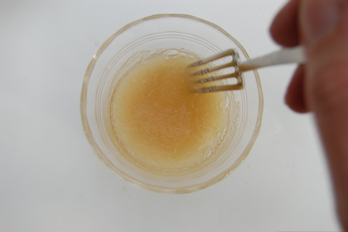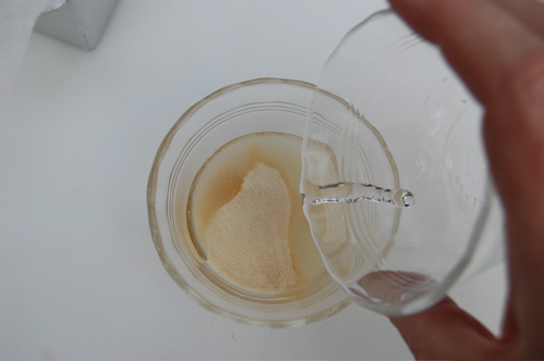…take it off the heat. Pour the two tablespoons of water you have standing by into the powdered gelatin…