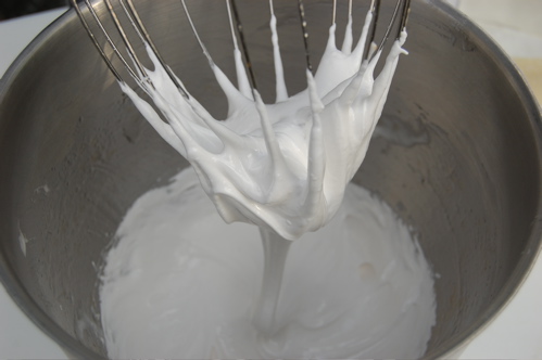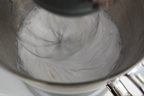 Turn the mixer back on to medium-high and add the syrup to the whipped egg whites. Don’t worry if some spatters onto the sides, since you can easily scrape it down, back into the main mass.