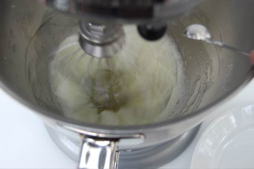 Insert them into your mixer fitted with the whip attachment and turn on medium-high. When the whites get frothy, add the cream of tartar which will help stabilize the foam: