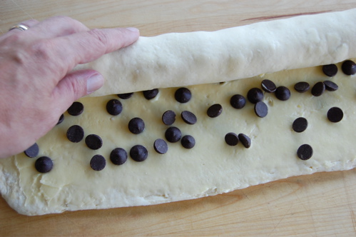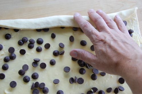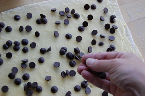 Start by rolling out again about a pound and a half of Danish dough into a rectangle, this time maybe a little less than a 1/4 inch thick. Again, the exact dimensions don’t really matter that much. If you’re making chocolate chip or pecan snails, put down a thin layer of buttercream (otherwise lay down whatever you wish). Then scatter your chips — or whatever — over the sheet.
