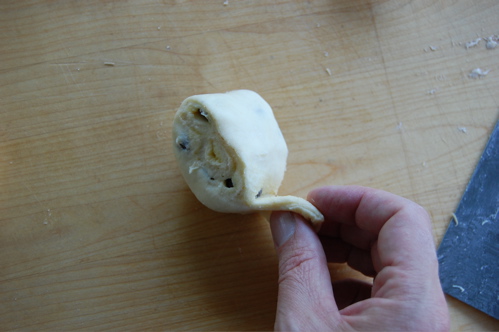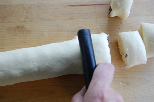Now, using your trusty bench scraper (or a knife), cut them into roughly inch to inch-and-a-quarter-long pieces. Don’t worry if they’re a littl squished, you can squeeze them back into shape. (IMPORTANT NOTE: Never show fear before pastry, my friends, or you will never earn its respect).