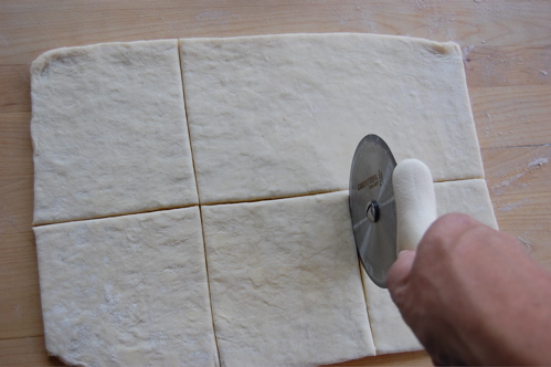 As for the pastry portion, begin by rolling about three quarters of a pound of pastry dough into a rectangle about a quarter inch thick (exact dimensions are not important). Then simply cut it into squares with pizza cutter like so: