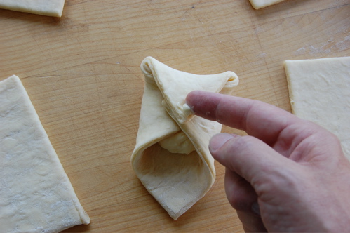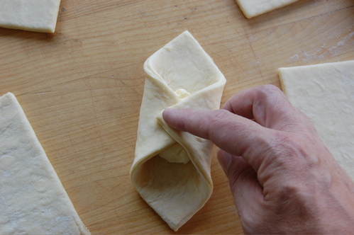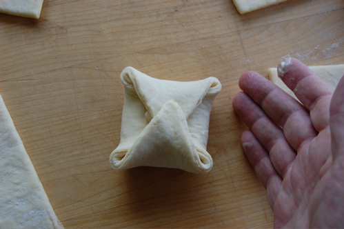 Then fold in the the first two corners. (NOTE: Stop here if you wish to make the Danish pastry shape known as an “envelope”, though this shape most commonly has jam or fruit in it).