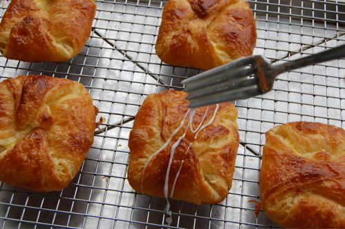 Proof, paint with egg wash and bake just like classic sweet rolls. In an ideal world I’d have made some streusel topping to sprinkle on top of these before I baked them (that’s how I learned to make’em anyway), but heck, a little icing after baking works just as well: