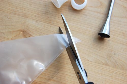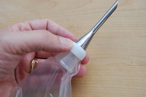 Hey wait! That bag doesn’t have a hole in it! See what I mean? The process isn’t intuitive at all! You have to snip the end off with scissors. How much depends on the size of the coupler. You may need to experiment a little, but the idea is you want a snug fit for the coupler. Trim off about three quarters of an inch: