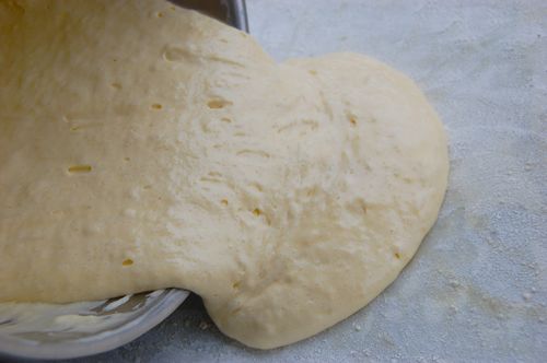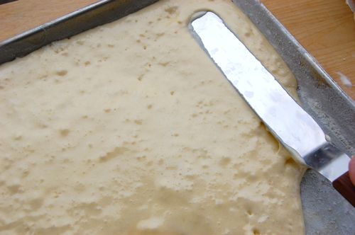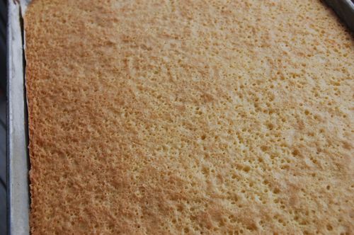 So then, remember that génoise batter from yesterday? Pour it very gently into your prepared (greased, lined with parchment or wax paper, then greased again and floured) 18 x 13 jelly roll pan.
