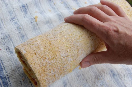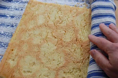 Now then, for the rolling. Turn the bottom edge of the towel up over the very end of the cake. If you have more than a couple of inches of towel down there you can double it over — all the better to keep the inside curl from breaking (mine did…oh well!).