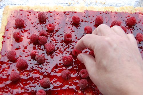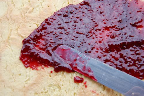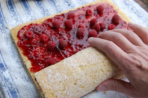 The spread on about a cup of your favorite jam. Spread it thin, leaving a half-inch border around the edges. Here’s I’m using raspberry…