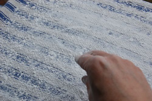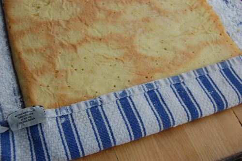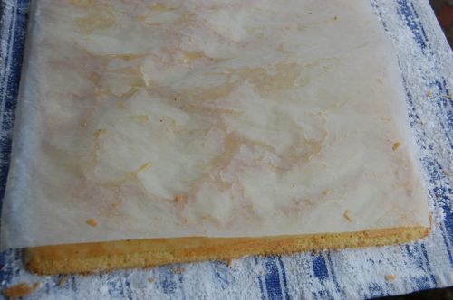 Insert the layer into your preheated oven (set to 400) for 8-10 minutes. While the génoise is baking, liberally dust a kitchen towel with powdered sugar, like so: