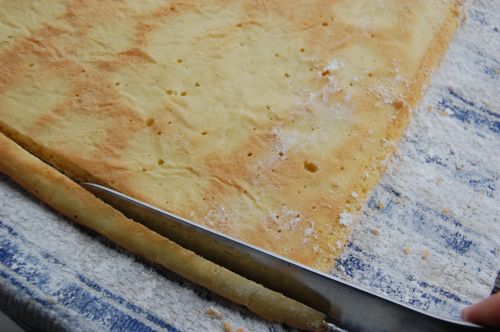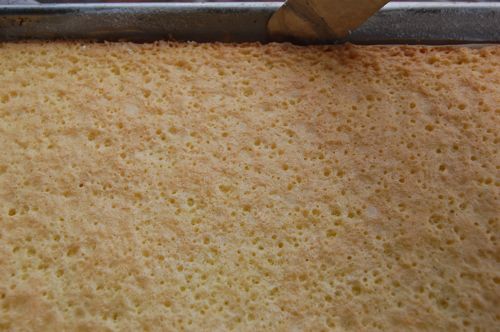 While the génoise is still hot, and with your icing spatula, loosen the edges and probe a bit underneath to make sure the cake sheet is well detached.