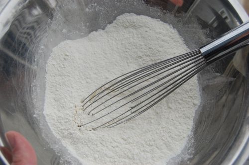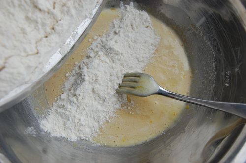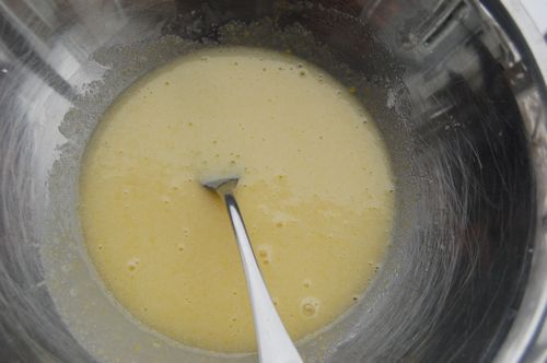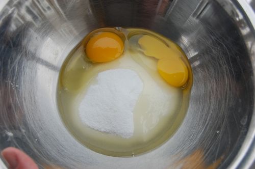 Combine your sugar and eggs and beat for a couple of minutes by hand until the mixture is light and color (just use a fork, it works great).