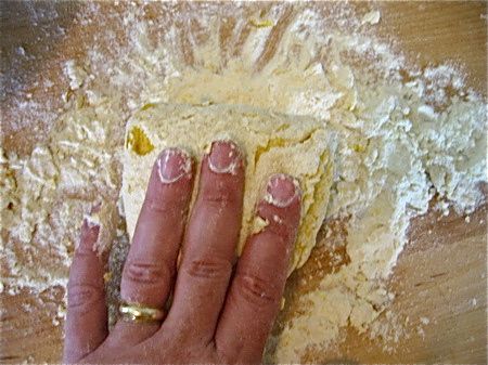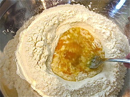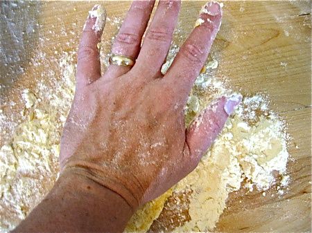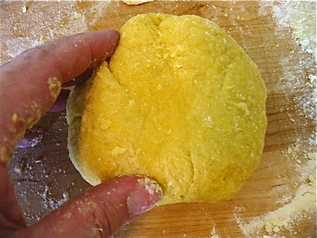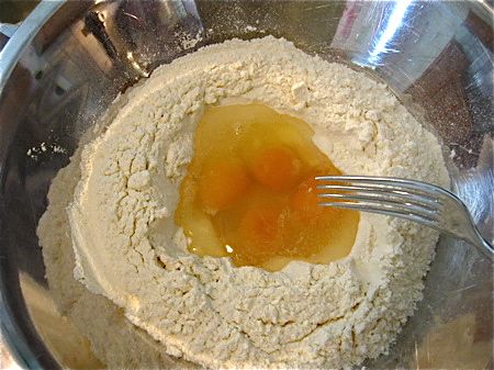 I have trouble making my pasta “the authentic way”. That is, mounding up my little flour volcano, dropping eggs in the center and beating them up with a fork. I always get a breach in the wall, which sends partly scrambled egg spilling out all over the place. I don’t like the mess, but even more than that I don’t like raw egg seeping into my wooden board. Not being Italian, I can say nuts to tradition and simply use a bowl.