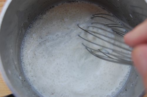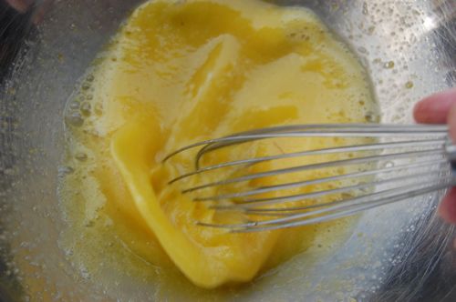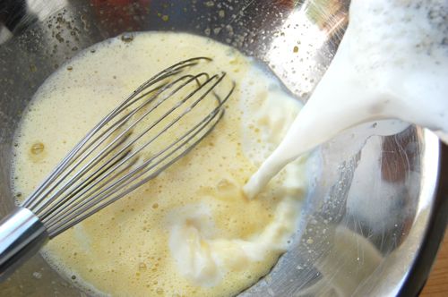 Add the hot milk to the egg mixture in a steady stream, whisking all the while.