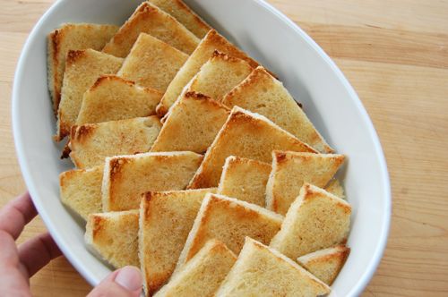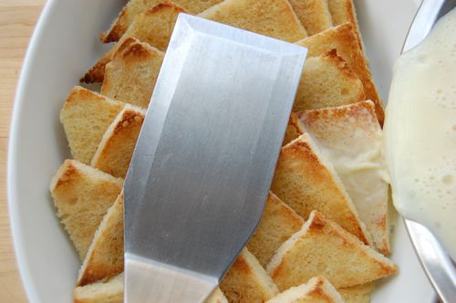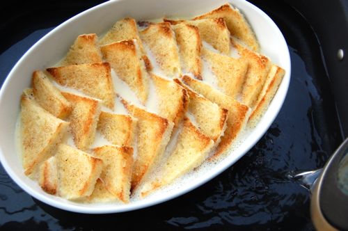 Strain the custard into another bowl, then slowly pour it into the baking dish. Use a spatula to keep the toast from floating around too much.