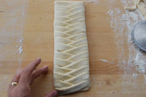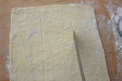 Now for the shaping. Roll and trim a roughly 14-ounce piece of Danish dough to a square about 14″ x 12″. Using an icing spatula or a butter knife, score the dough lightly into thirds.