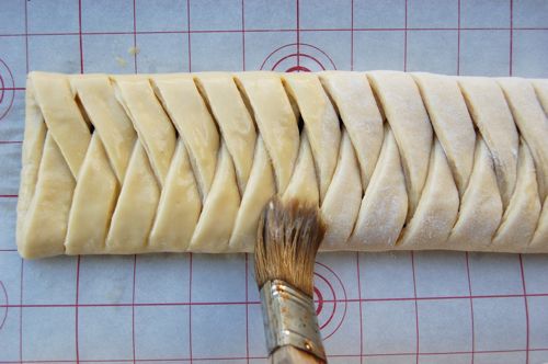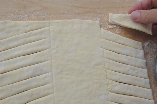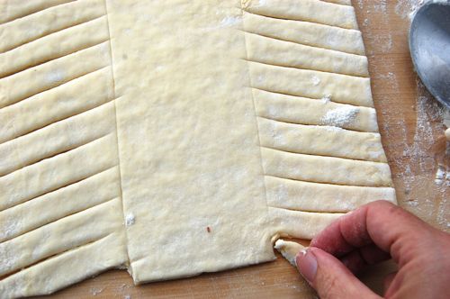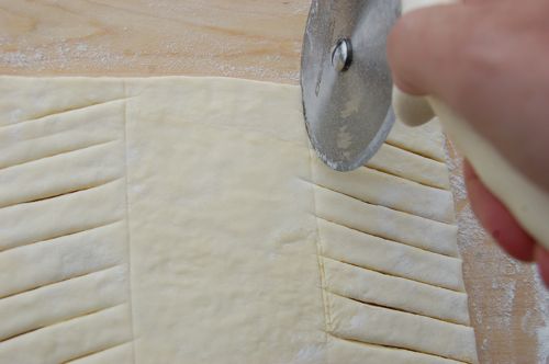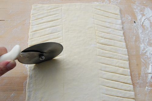 Make a series of sloping cuts in the dough, about half an inch apart, down each side of the dough piece. A pizza cutter is the perfect instrument for this job, but a sharp knife will also work.