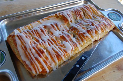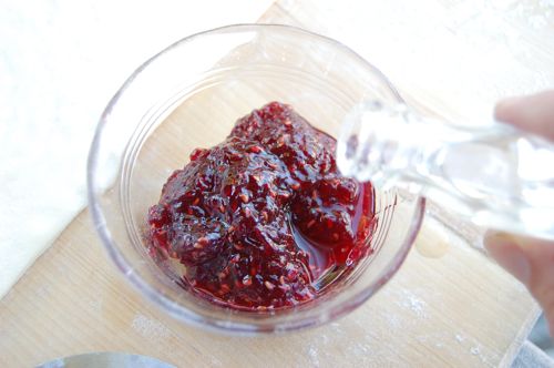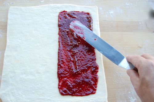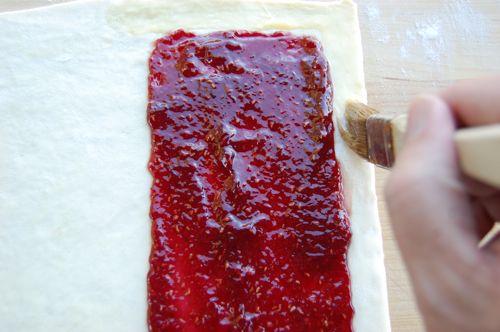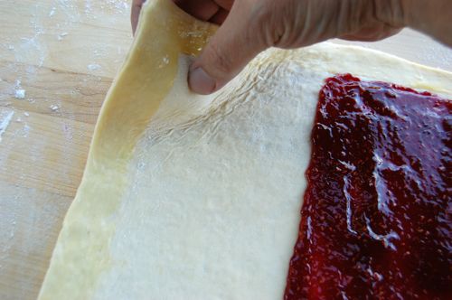 Just like the kind that comes in the box at the grocery store, only much, much, much, much better. This is the easiest kind of all to shape, and can be filled with pretty much anything from jam to chocolate to cheese to fruit. This one will be raspberry. Start with about a third cup of raspberry jam. Add a few drops of almond extract for extra awesomeness and stir it in.