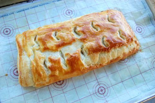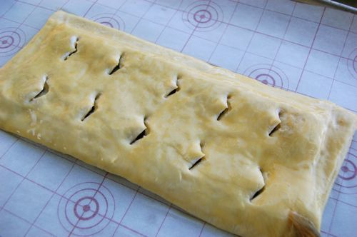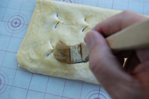 Paint the pastry with egg wash, being careful not to seal the vents shut.