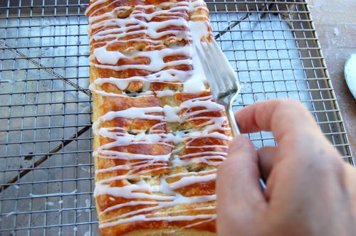 Bake it about half an hour until the top is a deep gold, turning the pan once at about the 20 minute mark. Pretty much all coffeecakes of this style split at least a little in the oven, since the very top layer of dough gets brittle in the heat. This one split quite a bit more than I was hoping.