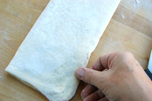 Ideally, you want a touch of overlap on the outer edge, since the tendency for the top layer of dough will be to lift off as it rises. Press firmly all around the outer edge of the pastry to seal it. Press down along the fold as well to discourage any bubbling or curling along that side of the cake.