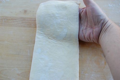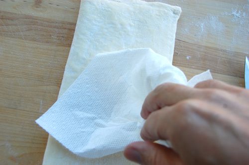 Paint it all around the edge of the dough piece, then lift up the far end…