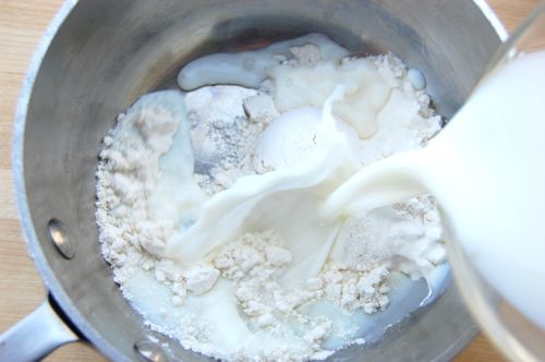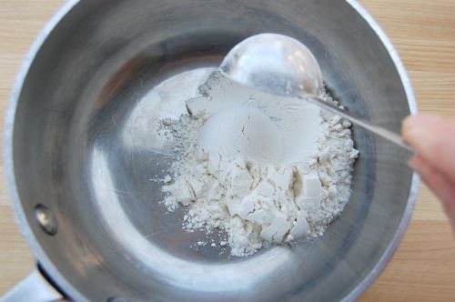 So how do you make “heritage” a.k.a. “boiled” a.k.a. “flour” a.k.a. “cooked flour” a.k.a. “gravy” a.k.a. “cloudburst” frosting? Just like this. Put four tablespoons of flour (1 1/4 ounces) into a small saucepan.