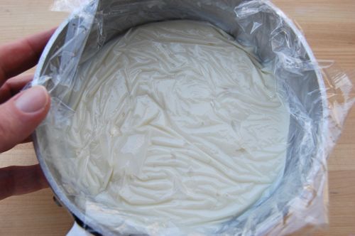 …then apply some plastic wrap directly onto the surface of the mixture. Let it cool another fifteen minutes or so, then put the saucepan in the refrigerator. Let it cool down for about an hour.
