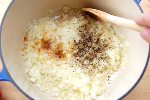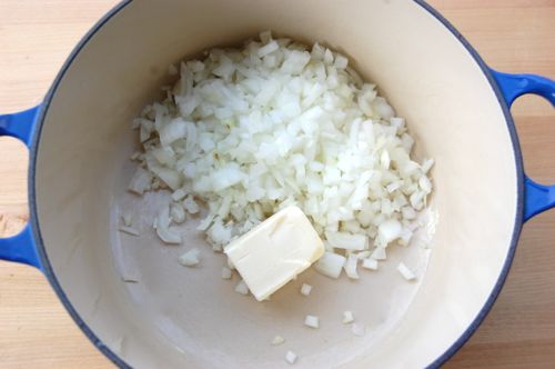 I was put in mind of those days while eating bastilla. Traditionally bastilla isn’t a main course but rather the opening of a feast. I now understand the genius of that, since bastilla has virtually every flavor and texture imaginable in it: savory, sweet, sour, spicy, hot, crisp, moist, chewy, crunchy…the list goes on. In it is a preview of every major theme that awaits the diner in a Moroccan meal. In other words, it’s a culinary overture. Begin yours by combining the butter and onions in a medium pot set over medium-high heat.