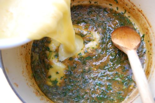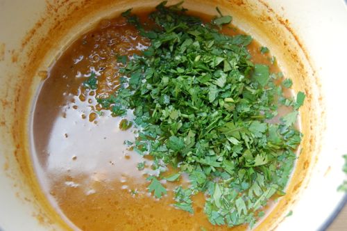 Now then, with the sauce reduced, drop the heat to medium and add the parsley and cilantro.