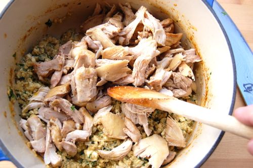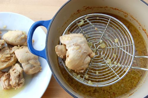 Meanwhile, reduce the liquid down. Remove the cinnamon stick then boil the whole mixture down to maybe a cup and a half — at most — over medium-high heat. I’ve seen bisteeya recipes that call for discarding some of this liquid. Blasphemy! You don’t want to throw even a drop of this flavor away. Concentrate it instead, you won’t be sorry.