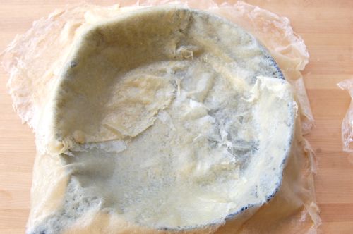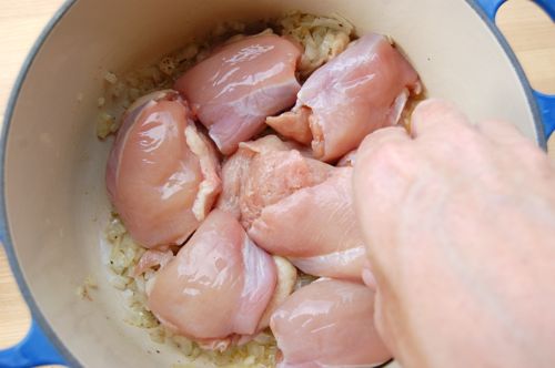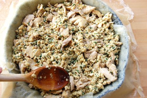 Put in about two pounds of chicken parts or squab (on the bone). Or for you vegetarians out there, about a pound and a half of assorted winter root vegetables. I used a pound and a half of boneless chicken thighs since I happened to have them in the freezer. That’s as much meat as this pie can stand.