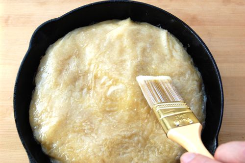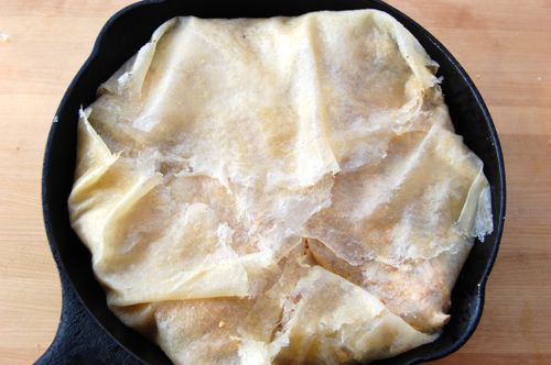 Secure a 9″ cast iron skillet or cake pan. Lay in several sheets of warqa pastry or phyllo in an overlapping pattern and brush them with butter. Give yourself plenty of overhang. Put another sheet right in the center there, lining the bottom (not shown). (Some assembly required).