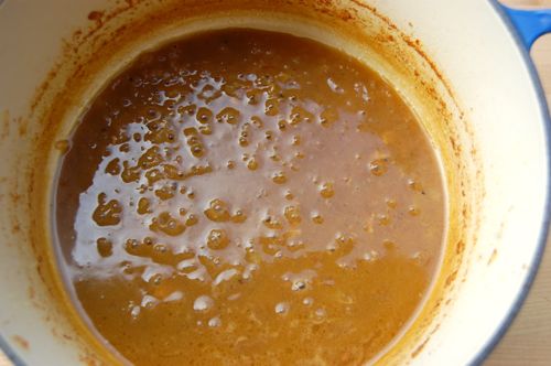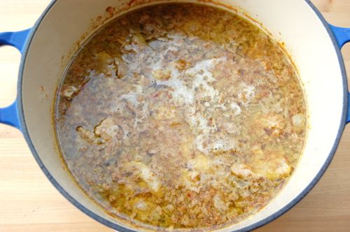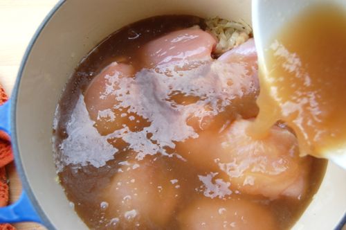 Cover with 2 cups of stock. This is some homemade brown chicken stock. It’s cold which is why it has a lumpy look…all the gelled collagen, donchaknow.