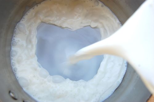 My daughters, my neighbors’ daughter, my neighbors and my wife were all stunned at how good this dessert was. On the face of it, it just doesn’t sound all that interesting. Meringue poached in milk? Oh, yippee. You really have to try this to understand how remarkable it is. With your caramel sauce and crème anglaise at-the-ready, start making your islands. Pour the milk into a saucepan and set it on to simmer.