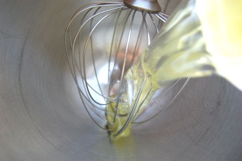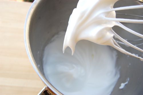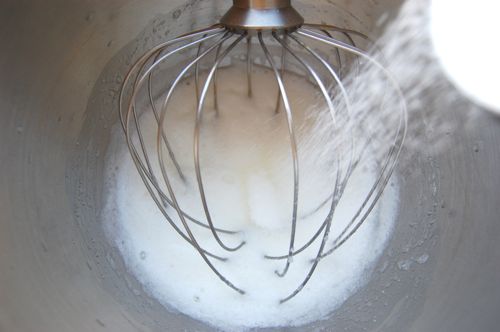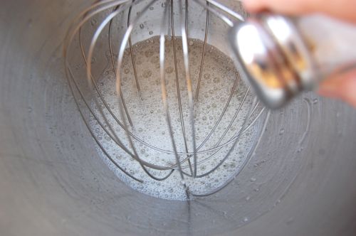 Whip on medium-high until the foam is opaque and start adding the sugar.