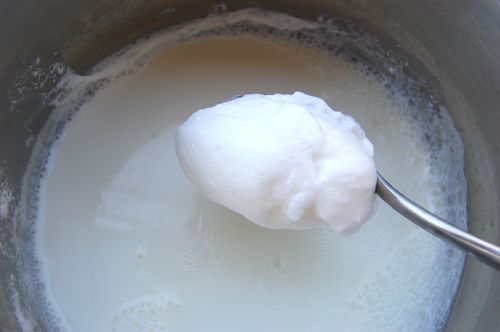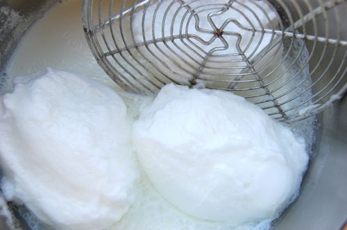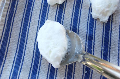 Then spoon up some of the meringue and drop it into the simmering milk. Poach from 1-3 minutes. I noticed that the longer the poaching goes on, the more the sulfur notes of the eggs comes out. That’s not necessarily a bad thing. The point is that these can be poached rather lightly if you wish.
