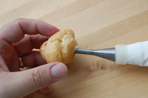 If you’ve had enough at this point you can stop for up to several weeks. How’s that? Because choux freezes very, very well. Put the puffs in freezer bags and wrap the base in thick plastic wrap. It’ll keep nicely. When you’re ready to assemble the pastry, affix a narrow tip to the pastry bag and fill it with pastry cream. Here I’m using a big ol’ Bismarck tip. Fill the puff, but not to bursting. You don’t want these things too heavy.