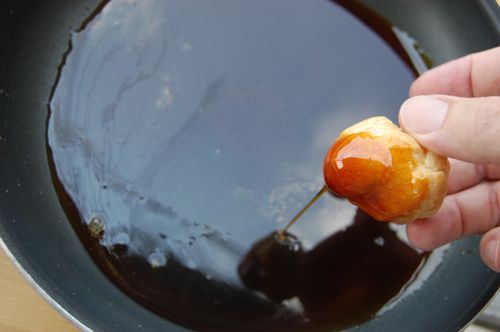 But where was I? Right. When they’re all done, I return to the first puff and dip the bottom (note that if the caramel is hardening at this stage, you can just return the pan to the stove top…high heat for 20 or 30 seconds loosened it back up).